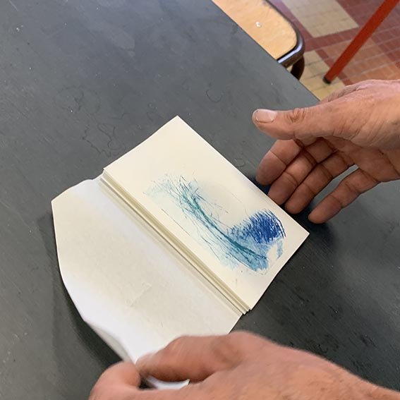 Atelier libre ouvert par Jean-Michel qui expérimente la gravure sur leporello.