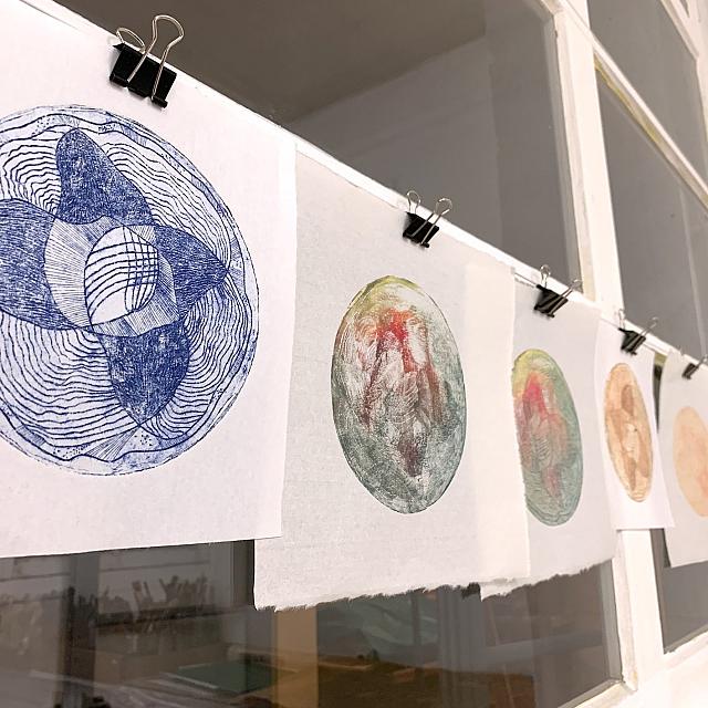 Atelier libre ouvert par Juliette qui expérimente la gravure sur carton aluminisé.